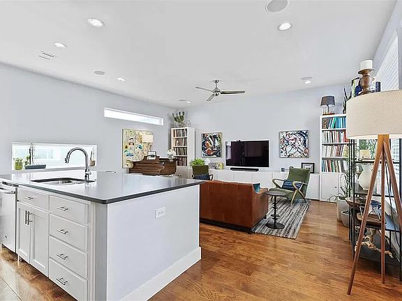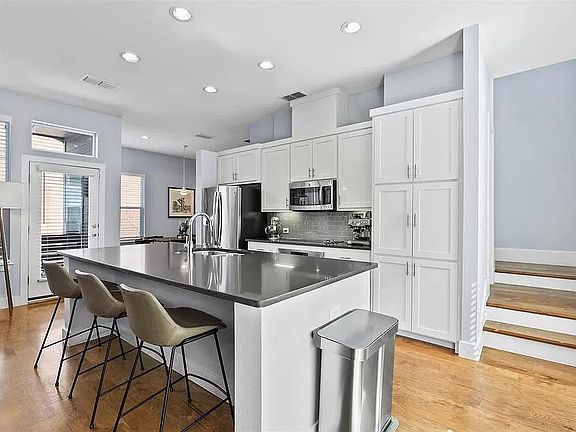 The second level features a spacious open floor living & dining areas, balcony, and half bath. The kitchen boasts a generous island, quartz countertop bar w/ seating area & good storage.