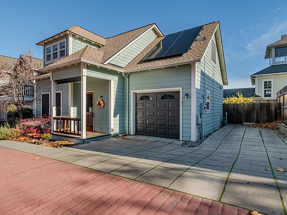 This home has two stories. The main level includes great-room with hardwood floors, a cottage kitchen with greenhouse window, half bathroom, and the single-car garage. Upstairs has full bath, two nice sized bedrooms - one with a dormer feature overlooking our ''Alley'', and a generous nook which could be your office, studio, or even converted into a third sleeping area. Windows and a skylight let the place glow!
