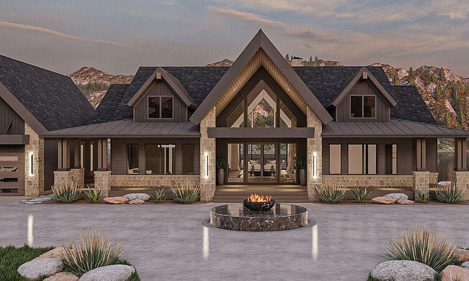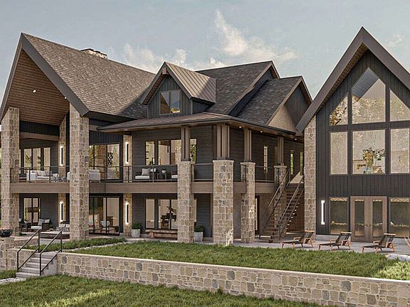Stylish cabinetryWide long-range mountain viewsTwo-car drive-under basement garageGlass-framed living spacesDramatic rooflinesTimber-accented gablesCathedral ceilings