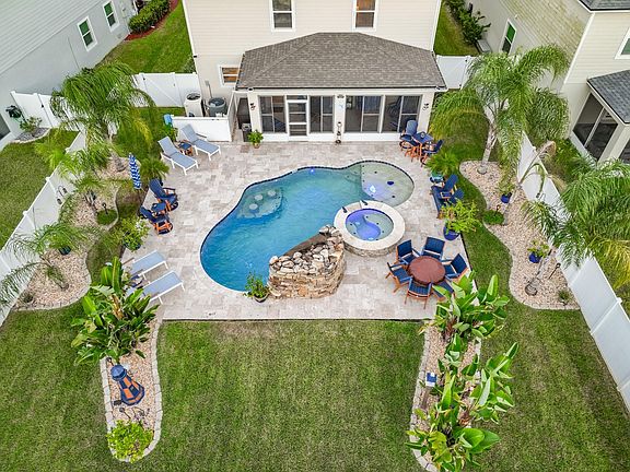 Welcome to this beautifully upgraded 3-bedroom, 2.5-bath pool home offering 2,228 sq. ft. of comfortable living space in a prime location near Treaty Park! Built in 2020, this home combines modern design with thoughtful enhancements inside and out. Step outside to your backyard oasis featuring a recently added saltwater pool with waterfall feature, sunshelf, evening pool lights, and shades, surrounded by meticulously planned landscaping. The screened porch overlooks this private retreat, perfect for relaxing or entertaining year-round. Inside, a bright foyer leads to a versatile flex space—ideal for a home office or formal dining room. The gourmet chef’s kitchen boasts granite countertops, a double oven, smart cooktop, prep sink, and a spacious island, flowing seamlessly into the breakfast nook and large family room for effortless entertaining. Upstairs, discover three spacious bedrooms, a convenient second-floor laundry with adjoining linen closet, and a generous loft area. The primary suite impresses with tray ceilings, a large walk-in closet, and a luxurious ensuite featuring dual vanities and an oversized deluxe shower with triple shower heads. Additional upgrades include a pavered driveway, epoxy-coated garage floor, water softener system, and drainage landscaping—all designed for convenience and low maintenance. Located in a community offering a pool and clubhouse, and just moments from Treaty Park, a 47-acre recreational complex with pickleball, tennis, paddle/POP tennis, basketball, trails, a dog park, ADA playground, skatepark, and more—there’s something for everyone to enjoy! This home blends function, style, and location—ready for you to move in and start living the Florida lifestyle.