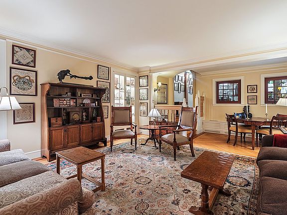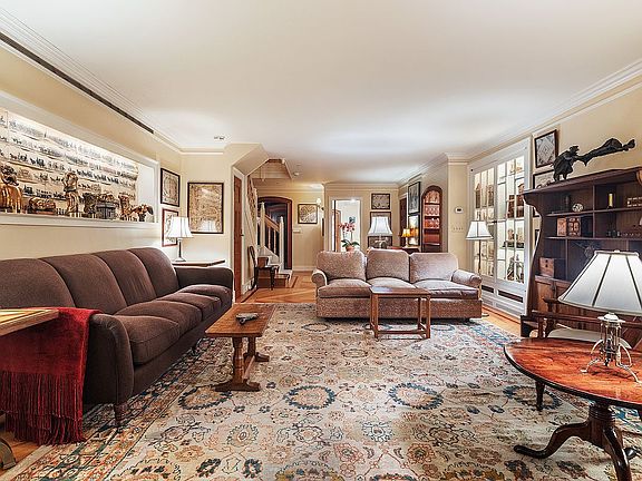 The living room features chevron-patterned wood floors with mahogany inlay and back-lit built-ins. Beyond the living room is the formal dining room, a unique feature of the homes at the four corners of the Gardens. Floor-to-ceiling windows, period mouldings and French doors leading directly into the Garden grace this magnificent room. The renovated chef's kitchen, also on the first floor, features custom steel glass-fronted cabinetry, stainless steel counters and backsplash and a commercial-grade 8-burner range with vented hood.