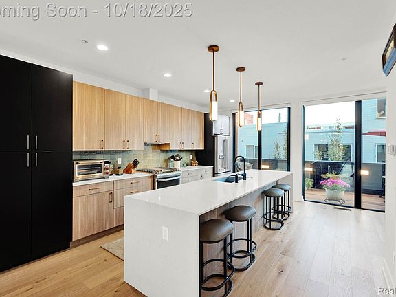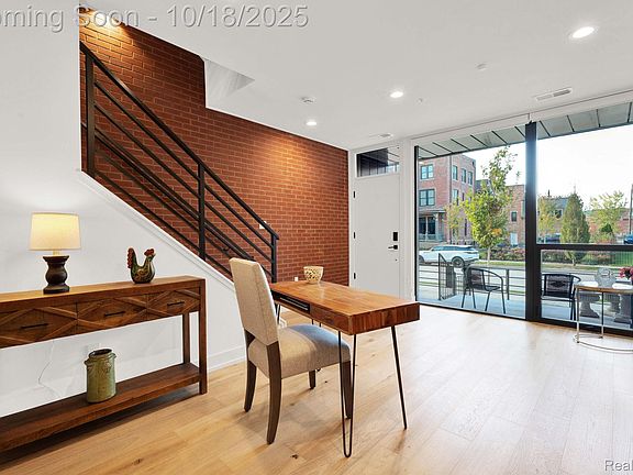 Experience the best of Detroit living in this stunning custom City Modern townhome, just steps from all three sports arenas and the city’s most exciting destinations. The first floor offers a versatile flex/studio space perfect for an office, gym, or guest suite. The second floor features an entertainer’s dream kitchen with a massive quartz waterfall island, extended buffet serving center, and full stainless steel appliance package including a Café refrigerator. The open concept dining and great room, half bath, and expansive terrace are show stoppers. Abundant natural light floods this home. The third floor includes two spacious bedrooms including the luxurious primary suite. The city views are breathtaking. Plus, there’s an en suite bath with a large tiled shower and two custom walk-in closets. This level has a convenient in-unit laundry. The penthouse is designed for entertaining with an additional half bath and access to two spacious outdoor terraces showcasing Detroit skyline views. And there’s a beautiful awning to keep you cool on those sunny days. Throughout the home: wide-plank hardwood flooring, metal stair accents, authentic brick interior walls, Euro-style shower doors, quartz counters in every bath, and an extensive recessed lighting package. Enjoy a private 2-car attached garage with direct entry and EV charger prep, dual furnaces, humidifiers, and A/C units. Located in an A+ Brush Park location and NEZ approved for valuable tax savings—this is modern city living at its finest.