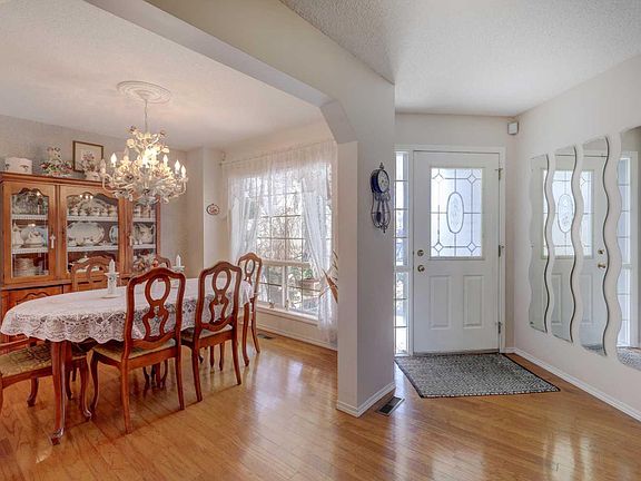 Inside, rich hardwood flooring spans the main level. Off the entryway, a spacious formal dining room offers versatility—ideal for hosting or a home office. A tucked-away half bath sits near the entrance to the attached double garage.