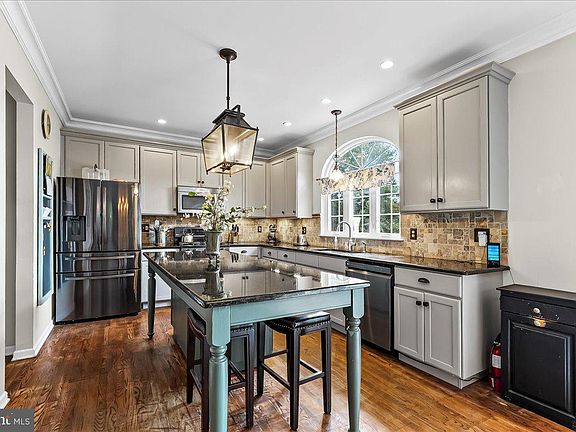 Welcome to this beautifully designed stone and siding home offering a perfect blend of elegance and functionality. The foyer greets you with hardwood floors and wainscoting, setting the tone for the attention to detail throughout. A formal living room/office features hardwood floors, crown molding, built-in bookcases, and abundant natural light, while the formal dining room provides the ideal space for entertaining. The gourmet kitchen boasts recessed lighting, crown molding, an abundance of gray cabinetry, granite countertops, a granite island, tiled backsplash, and a stunning Palladian window. The kitchen flows seamlessly into the breakfast area with sliders to the back deck, as well as the spacious family room featuring crown molding, walls of windows, and a propane fireplace. A laundry room with cabinetry, powder room, and a two-car garage with workbench areas and walk-up attic storage complete the main level. Upstairs, the luxurious main bedroom suite offers a tray ceiling, walk-in closet, and spa-like bath with double sinks, soaking tub, and separate shower. Three additional bedrooms and a large tiled hall bath complete the upper level. The lower level is designed as a full in-law suite with a slider to a concrete patio, living room with hardwood floors and beverage station, bedroom with multiple closets, full tiled bath, small gym/den, and utility/storage room. Enjoy outdoor living on the Trek deck overlooking lush grass and mature trees, with access to the concrete patio and a large shed. This home truly offers space, comfort, and versatility for today’s lifestyle.