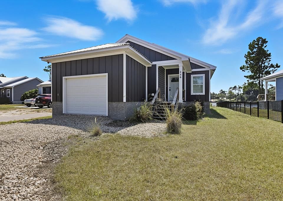 Embrace lakefront luxury with this brand-new 3 bedroom, 2 bathroom home situated in an exclusive gated subdivision on Lake McKissack. Perfectly designed for those who want the peace and beauty of lakefront living while staying just minutes from the coast, this home is less than three minutes to Carrabelle Beach and the nearby public boat launch, making every beach trip or water adventure effortless. From the moment you step inside, you are welcomed by an open-concept floor plan enhanced by vaulted ceilings that create a spacious and inviting atmosphere. The kitchen serves as the heart of the home, featuring granite countertops, stainless steel appliances, and a large island that is ideal for both casual meals and entertaining. The living areas are finished with durable Luxury Vinyl Plank flooring, while plush carpet provides comfort in all bedrooms. Both bathrooms are designed with style and function in mind, offering tiled shower and bath combos. Built to last, the home is wrapped in Hardy board siding and topped with a metal roof, ensuring durability and low maintenance for years to come. The property also features a private driveway, professional landscaping, and a sprinkler system to keep the grounds lush and welcoming. With the home situated on one and a half lots, you will enjoy extra outdoor space, perfect for relaxing, gardening, or future enhancements. This home truly offers the best of both worlds. Tranquil lakefront living with quick access to the sandy shores of Carrabelle Beach, the Gulf of Mexico, and all the fishing, boating, and outdoor adventures the Forgotten Coast is known for. Buyer to pay doc stamps and title. Don't miss your opportunity to own this incredible lakefront property and start living the lifestyle you've always dreamed of.