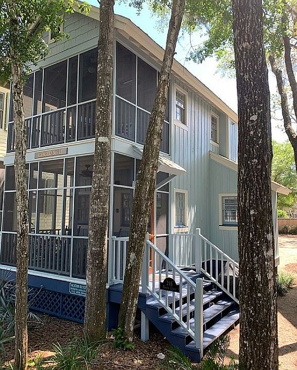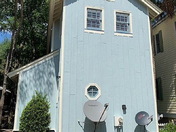 FSBO-Turn-Key- Two-story free-standing cottage – the bottom floor contains a king size bed and 2 full bathrooms. Travel up a small winding staircase to arrive in the main area of the cottage. The cottage contains a kitchenette, living room with a sleeper sofa and twin sleeper ottoman and a screened porch with outdoor heater and dining table for six. Both the living area and bedroom have current flat screen TVs. You will love the spaciousness and décor of this newly renovated cottage! The second story porch of this cottage is screened in and is nestled in the live oaks with a picturesque view of the property.