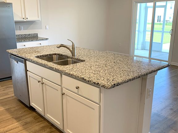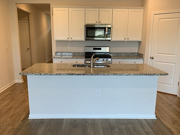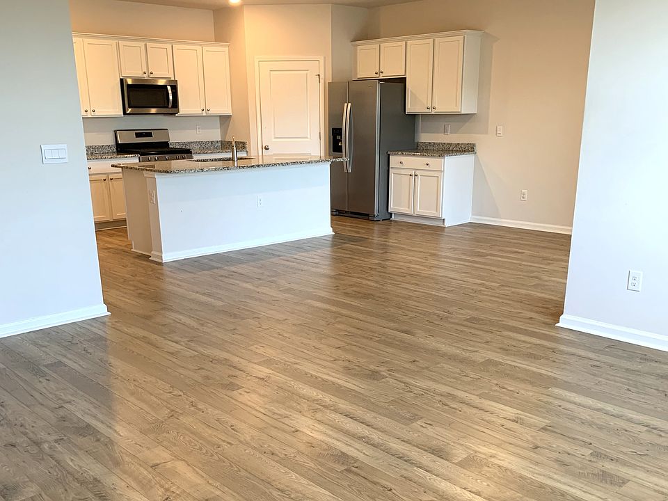 The home features a large open floor plan with luxury vinyl plank flooring throughout the main living areas and carpet in the bedrooms for added comfort. The kitchen is equipped with stainless steel appliances, a gas range, granite countertops, a large kitchen island, and a walk-in pantry, making it ideal for cooking and entertaining.