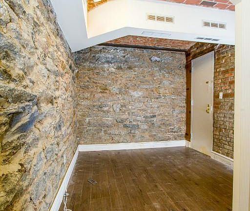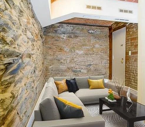 Deco fireplaceExposed brickPrivate gardenModern bathroomHigh ceilingsCrown moldingPlank maple floors