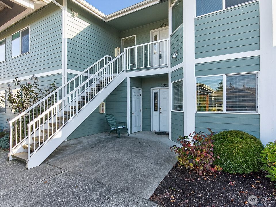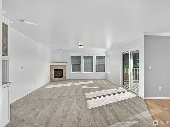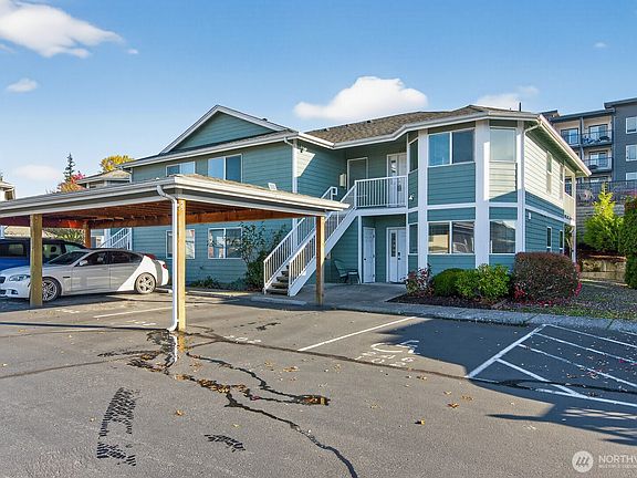 Welcome to this spacious 1,493 sq. ft. upper unit, open floor plan home. Lots of windows allowing bright light in. Newly remodeled kitchen with a pantry, new kitchen windows, new LVP flooring & a spacious dining area that connects the large living room with a corner gas fireplace to curl up to. New carpeting throughout. Covered balcony for all weather use. Primary bedroom has a walk-in closet and an ensuite bathroom with a jetted tub, separate shower & double vanity. Roomy second bedroom is located next to another full bathroom. Separate laundry room has ample space with new washer and dryer. More closet space in the hall & entry. Two dedicated parking spots out front with one covered. Close to all amenities!