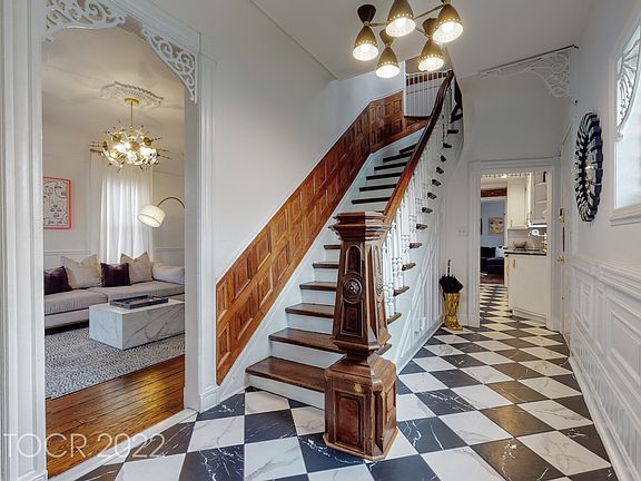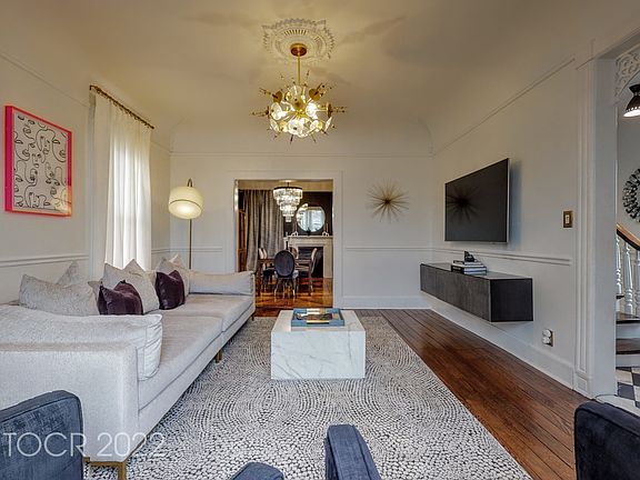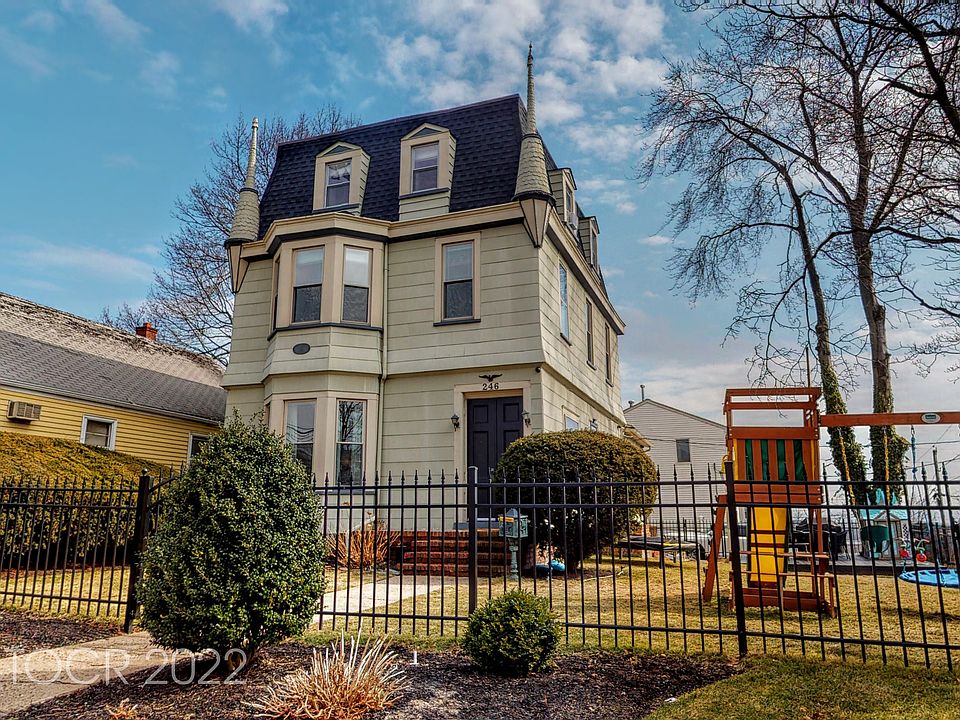 "One-of-a-kind" truly befits this extraordinary property: a genuine French Mansard Maison, featuring EF, LR, Modern Kitchen, DR, Family Room, laundry, 5 BRs (MBR w/dressing room), 2 1/2 baths and full, unfinished basement. Tasteful, designer-inspired eclectic interiors that highlight the custom hardwood inlay mosaic floors, exposed brick walls, graceful staircase, decorative fireplaces, priceless stained glass windows, the abundance of natural light in every room of its sturdy, well-constructed 3 story frame [the rear of which providing stunning panoramic NYC skyline views!]. Updated through-out, with upgraded systems and modern, stylish baths and kitchen. Enclosed oversized property - metal fence - with play area and storage shed. Lots more to be seen and savored! Magnifique!