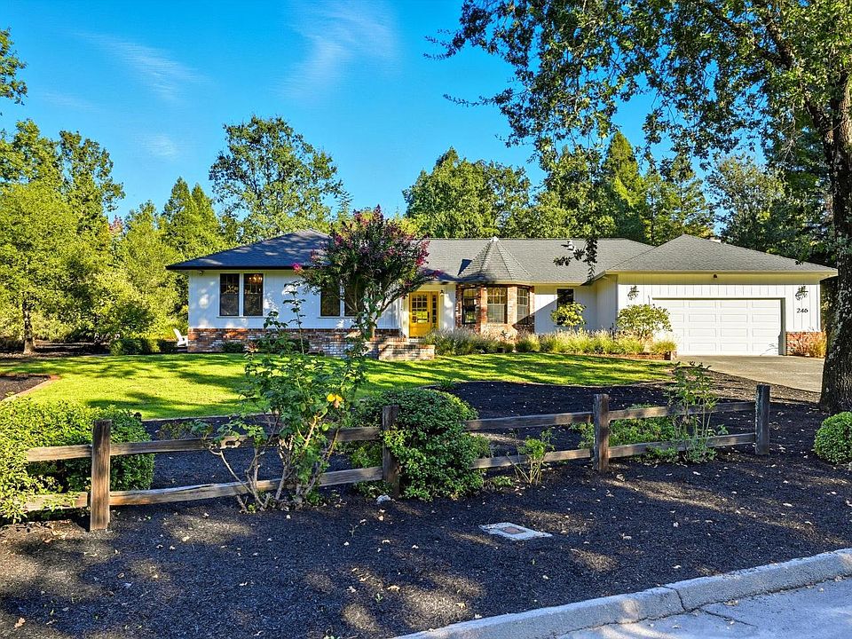 Serene country living meets city convenience in this highly desirable North Healdsburg neighborhood. A sprawling 1.17-acre lot features a 4-bed, 2.5 bath ranch and guest cottage, just 8 mins from Healdsburg Plaza. The home welcomes you with hardwood floors and vaulted ceilings. Relax in the formal living room with a wood-burning fireplace or the family room with a wood-burning stove. The chef's kitchen boasts a 6-burner range, large island, a double oven, stainless steel appliances, and a pantry. Enjoy indoor-outdoor living via a kitchen slider and family room French doors. Bedrooms are tucked away, including a spacious primary suite with backyard access to the hot tub. The primary bath offers dual vanities, a soaking tub, and a walk-in closet. The expansive patio, mature oaks, and redwoods offer privacy and ambiance. Two lawns, a deck with a fire pit, and fruit trees create a dream backyard with space for a pool, outdoor kitchen, and gardens. The guest house features its own garage, laundry, and driveway. An ideal spot to land in wine country, just add your personal touch to make it the home of your dreams!