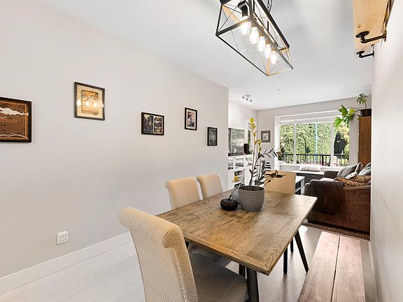 This quiet, ground-level corner unit offers over 1,088 sqft of modern living space, including two bedrooms, two bathrooms, and a versatile den perfect for an office or flex space. The open-concept layout features a contemporary kitchen with quartz countertops, stainless steel appliances, and a cozy living room with green views. Step outside onto a spacious wrap-around patio of over 300 sqft, complete with a charming electric fireplace—ideal for entertaining. Located just steps from Gates Park, the Coquitlam River, trails, shopping, and transit, this boutique building provides a peaceful, friendly community with bike storage and an amenity room. Enjoy spacious, comfortable living in a prime, tranquil setting.