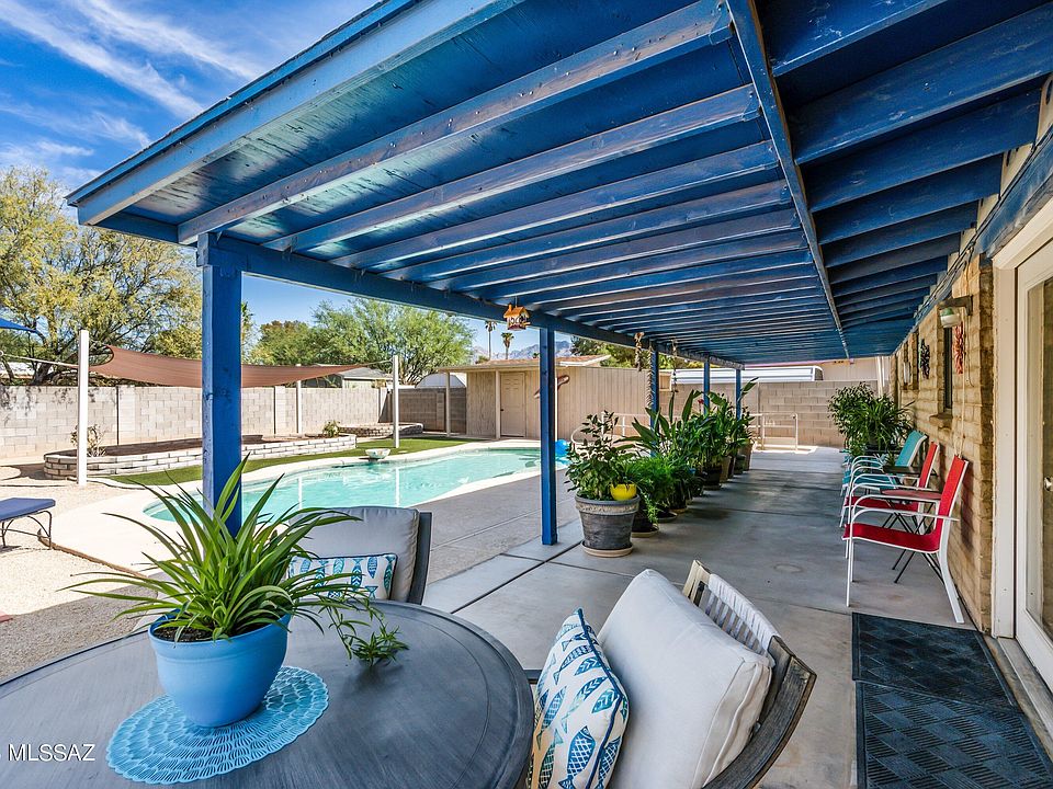 Charming slump block home with a huge backyard and newer pool, in a great NW location, quiet neighborhood with wide streets, at the end of a cup de sac. NO HOA!! Shopping and amenities within minutes. Pool was built only 5 years ago, and home was remodeled in 2018 -new windows and backdoors, concrete floors, 6ft block walls around backyard,, wide metal gate with room for RV, ''pool house''/storage room, turf,flower beds, both bathrooms remodeled, and extended the back porch.The large covered patio is the perfect relaxing and entertaining area, with some Mountain Views! Inside you have tall vaulted ceilings, great views of the pool and backyard from some windows and beautiful green trees form the others, great privacy all around. The terra cotta colored concrete floors and exposed brick The terra cotta colored concrete floors and exposed brickwalls add a ton of charm and character to the home. Secondary bathroom has a big jetted tub for relaxing baths, and the primary bathroom has a big walk in shower. Primary bedroom has vaulted ceilings and french doors leading out to the inviting patio and pool area. The laundry room is huge with a ton of storage space, and there are 2 additional closets in the hallway and a coat closet as well, making every inch of this smaller home very functional!