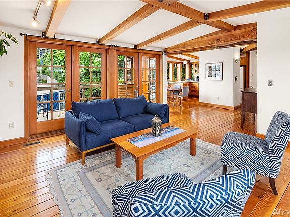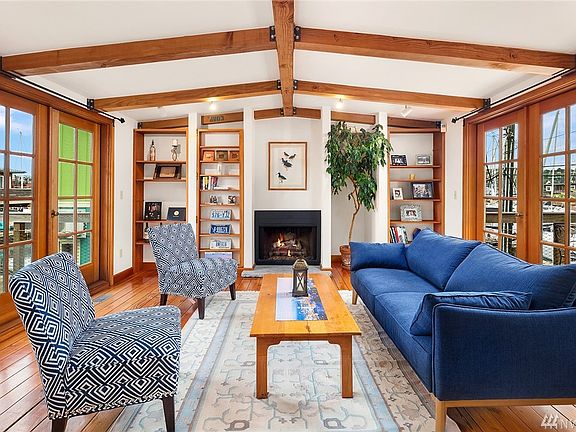 Spacious Light Northwest Craftsman floating home (1840 sf) designed by James Jessop. A rarely found large exterior space with 1190 sf of exterior decks, three on upper level plus an 11x40' auxiliary float & two boat slips, plenty of space for kayaks & a yacht. Reverse floor plan with upper living spaces. Open beamed ceilings with 9 sets of French doors framing lake & channel views. Clear fir floors throughout. Co-op dock next to walking path & bike trail and city pocket park. Zoned resident prkg