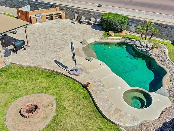 Welcome Home! Get ready to fall in love with this beautifully maintained home, nestled on over 13,500 sqft of manicured land. With an enchanting pool, spa, and waterfall to the outdoor grill island, fire pit, and stunning mountain views, this stunner is every entertainer's dream! Step inside to discover a sprawling floor plan that seamlessly blends elegance with functionality. Boasting 3 bedrooms, 2 bathrooms, a study, and a separate rec room, this home provides ample space for both relaxation and recreation. The heart of the home lies in the chef's kitchen, where Caesarstone counters, a gas cooktop with range hood, wall oven combo, upgraded cabinets, plank tile flooring, and recessed lighting converge to inspire culinary excellence. Retreat to the spacious main bedroom, complete with an ensuite featuring a beautifully tiled dual shower, separate bathtub, dual sink vanity, and walk-in closet with built-in shelving. Don't miss your chance to experience the exceptional lifestyle offered by this fabulous home.