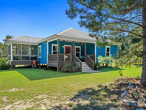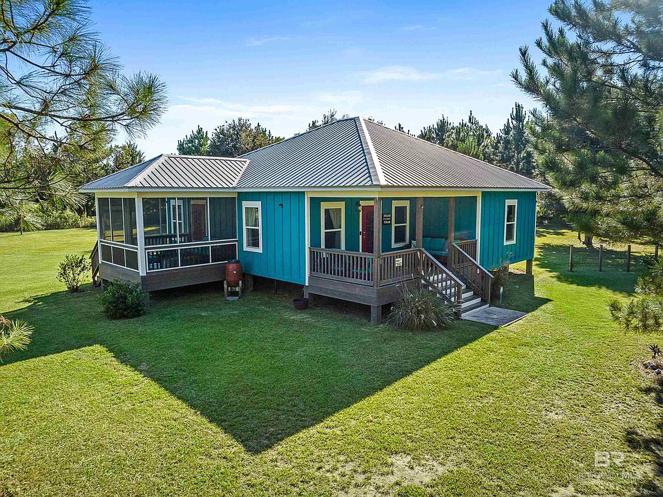Welcome to 24616 Bretz Lane, a FORTIFIED Silver-certified home (IBHS, 2025) featuring hurricane-resistant windows and exterior doors for lasting peace of mind and the benefit of lower insurance costs. Tucked behind a gated entrance where a winding driveway through the pines opens to your own peaceful retreat, this charming 4.4-acre property offers a private country setting less than two miles from the heart of Elberta, with convenient access to Highway 98 and the Foley Beach Express for quick travel to Foley, The Wharf, or the beach. Built to last, this FORTIFIED Silver home features a metal roof and a layout that maximizes every square foot. The home offers 9-foot ceilings throughout, except for the living room, which boasts a vaulted ceiling. Recent updates in August 2025 include new carpet and padding in the living room, hallway, and bedrooms, plus new porcelain tile in the kitchen, dining, and utility areas. The living area feels bright and open, flowing seamlessly into the dining area and kitchen. Windows fill the space with natural light, creating a warm and welcoming kitchen with features that include granite countertops, stainless steel appliances, a walk-in pantry, custom lighting, and a breakfast bar with extra storage and seating. The primary suite includes a walk-in closet and a beautifully finished ensuite bath with tile flooring, a granite-topped vanity, a spacious walk-in tiled shower, and windows that let in soft natural light. Two guest bedrooms share a full bath with a custom vanity, a tiled tub and shower combo, and a clerestory window that brightens the space. The utility room provides built-in shelving and hanging space. Relax on the inviting front porch or unwind on the screened-in side porch overlooking the open yard. A shipping container out back offers space for storage or a workshop. With no HOA, a secure gated entrance, and the durability of a FORTIFIED Silver design, this home is the perfect blend of charm, privacy, and practicality. Buye