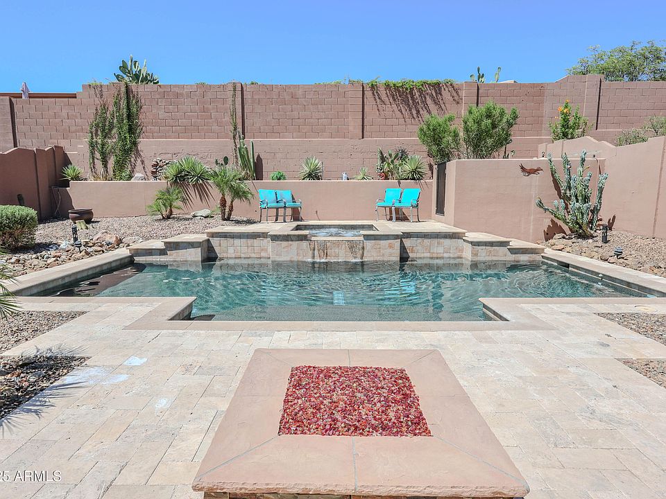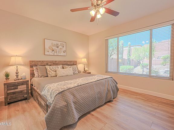Extended travertine paver patioSplit bedroom floor planFresh paintWhite cabinetryWalk-in closetGranite countersSpa-like walk-in shower