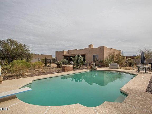 Featuring 3 bedrooms plus an office/den and 2 full baths, the spacious master suite includes a separate exit to the covered patio, a soaking tub, separate shower, and walk-in closet. Cozy up by the fireplace on cool desert evenings or take a dip in the diving pool while enjoying stunning mountain views. Garden enthusiasts will love the greenhouse, and yes, there's even space for chickens! With a private water company, no HOA, and true Arizona outdoor living, this home is ready.