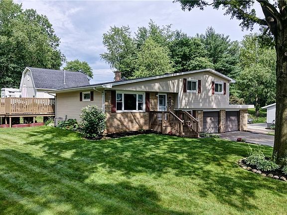 Beautiful open concept first floor living, uniquely decorated. Living room has bamboo flooring with a throw rug, newer light fixtures and paint. The kitchen has been completely remodeled in 2016 with custom cabinets, bamboo flooring, granite countertops, light fixtures, LG appliances', refrigerator, stove, microwave and dishwasher, granite countertops. There is a dinette area and a bar with numerous cupboards and drawers. The upstairs has 3 bedrooms and a full bath, all with fresh paint, and light fixtures. The downstairs levels have a mud room, which accesses the garage, a laundry room with a walk-out and the lower level has the 4th bedroom with a closet which could be used as a family room or office. Open the back door to an inviting patio with 12'x12' gazebo and above ground pool, 15' round and is heated. There is a garage/workshop 24x28 2-story with electric and gas, one garage door and a separate entrance, and an upstairs. There is a shed also in the backyard. Utility averages: $97/gas; $125 electric.
