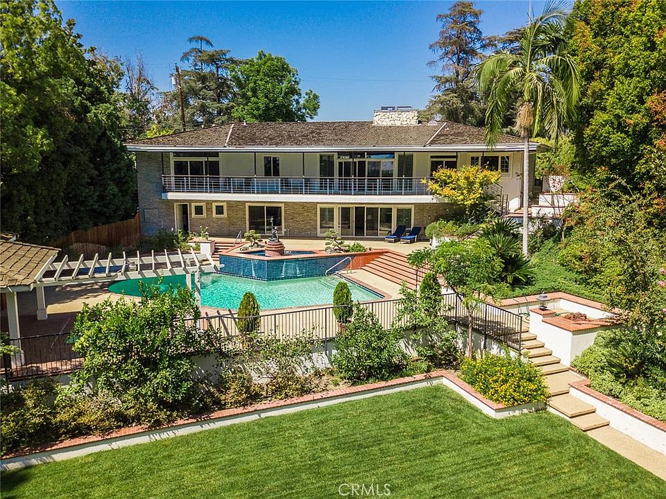 This gorgeous two-story traditional estate is located on one of San Marinos most elegant streets near Huntington Library. It has great curb appeal and sits atop a gentle hill on a 30,000 square feet lot with a spectacular Park-like garden view. Beautifully remodeled and updated, this 4 bedrooms and 5 bathrooms home, has been lovingly maintained and is bright with an ideal floor plan. Double glassed windows/doors and Hardwood flooring are throughout the house. The first floor features a Hanson entry, a Bright and airy living room with fireplace, ample family room with fireplace, and large sliding glass doors directly leading to a spacious large balcony overlooking a magnificent scenery park-like garden. Spacious formal dining room flows smoothly to adjacent a fully upgraded kitchen with a big center island, breakfast bar, top of the line appliances, double ovens, and desk area. A large master suite with a sitting area, generous master bath with soaking tub, glass enclosed shower, marble tile flooring, granite counters, and adjacent walk-in closet, and the master suite also leads to the large balcony. Two additional bedrooms with their own closets, share a spacious bath. A separate laundry room and two powder rooms finished the first level. At the lower level, a media room with a bar & fireplace. Lower level offers additional space for entertainment and storage. 11 majestic Deodar pine trees surround the garden, amongst mature trees, plants, flowers & fruit trees. A resort-like entertaining ground designed with a large sparkling pool, a spa, a poolside mermaid fountain, a pavilion, a BBQ counter bar, a fire pitch area, garden steps and walkways with garden lamps, all bring California outdoor living to its best!