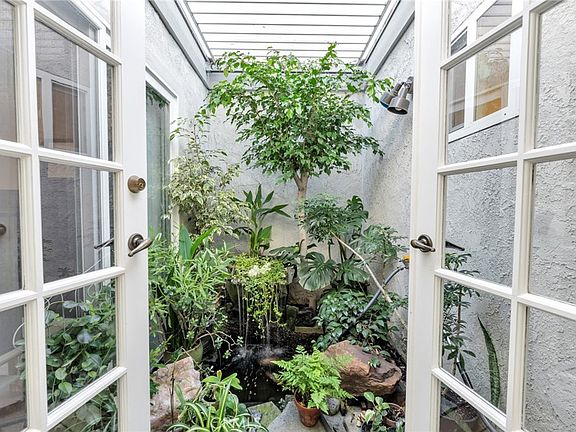 Tucked away at the end of a quiet street in Aegean Heights, this distinct single-level end unit is enveloped by landscaped gardens and serene grassy hillsides, offering privacy and natural beauty. At the heart of the home is a stunning atrium—a true sanctuary—featuring a complete pond ecosystem with circulating pump, waterfall, lush plantings, and an automatic timer. Screened doors allow you to keep the atrium open year-round for the ultimate indoor-outdoor experience, with direct access from both the entryway and guest bedroom.