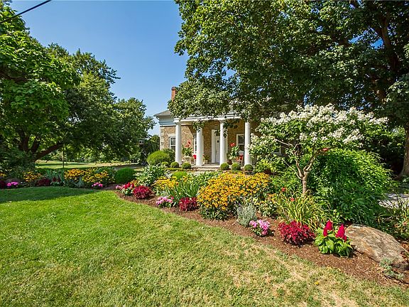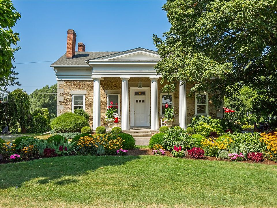 This beautiful 4-bedroom, 2-bathroom Cobblestone Greek Revival sits on a sprawling 19.06-acre lot, offering a perfect blend of classic elegance and natural serenity. Step inside and be greeted by the warmth of hardwood floors that flow seamlessly throughout the 2,606-square-foot home. Throughout the years, the sellers were careful to maintain the original charming character of the home during its various updates. The heart of the home is the stunning kitchen, featuring butcher block countertops and a cozy wood-burning fireplace perfect for intimate gatherings on a chilly evening. Outside, the property is a true masterpiece of design. The meticulously maintained grounds boast exquisite gardens, mature trees and stone landscaping features creating a vibrant and welcoming curb appeal. A 24x72-inch pole barn on the massive 20-acre lot offers endless possibilities for hobbies or storage. Relax and entertain on the huge slate patio, surrounded by the beauty of nature. The front porch, with its magnificent wood pillars, adds a touch of timeless sophistication, inviting you to sit and enjoy the peaceful surroundings. This centrally located property between Canandaigua, Keuka, and Seneca lakes is more than just a home; is a private retreat waiting for you. Additional land is available. Delayed negotiations until 8/28 at 12pm. Some photos are digitally staged.