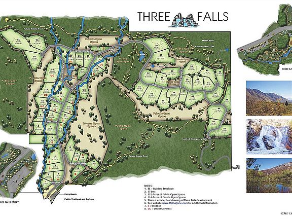 Amenities: onsite security, members' picnic pavilion with restrooms adjacent to a natural granite water slide pool and endless hiking and mountain-biking trails. Living in Three Falls you will enjoy life-long memories of the best life has to offer. Also, included are sematic contemporary house plans designed by Michael Upwall.