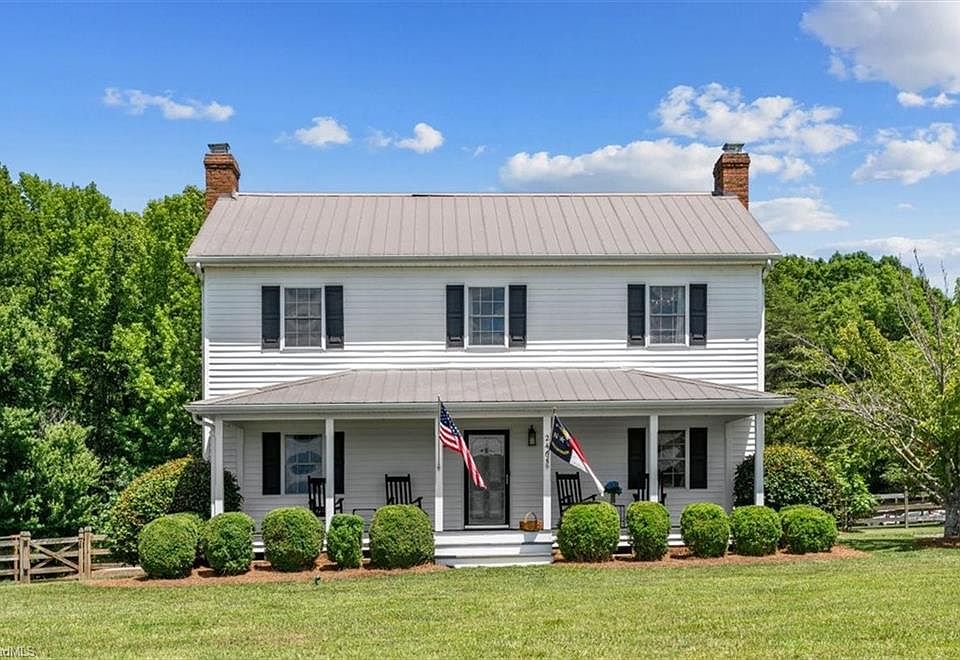 7.72 ACRES! This is it...your dream home! RARE offering in Kernersville! This breathtaking, white farmhouse was completed in 2002 but was designed to resemble an 1800's farmhouse! Let this home take you back to a more simple, less stressful time! Relax on either the full front porch with new ceilings fans or the side porch (both are freshly painted). Primary bedroom is on the main level! Spacious living room and kitchen/eat-in area has room for everyone!There is also a half bath/laundry room area with a unique, antique English sink basin. Travel upstairs where there is another full bathroom and two additional bedrooms, office and bonus room with new vinyl plank floors.Go ahead and plan a BIG event outside because the deck and brick paver patio are NEW and ready to be shown off! Blackberry bushes, Blueberry bushes and fig trees are producing! The front pasture has an established and maintained fescue hay field. SO many other homesteading ideas that could be done on this amazing acreage!