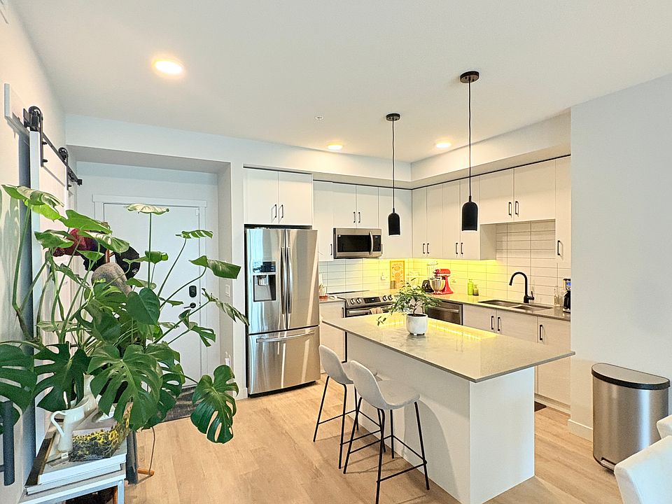The open living space is highlighted by a cozy electric fireplace and elegant barn doors that add charm while maximizing functionality. The kitchen shines with stainless steel appliances, quartz countertops, and sleek finishes, while the generously sized bedrooms provide plenty of comfort. The ensuite features upgraded glass shower doors, and the large laundry/storage room doubles as a flexible workspace for added convenience.
