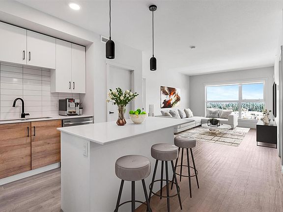 TOP & Corner FLOOR condo in a vibrant community surrounded by lakes and green space. This 2 bed, 2 bath home showcases a modern open layout with a chef-style kitchen featuring a large quartz island, stainless steel Energy Star appliances, and triple-pane windows that create a bright, efficient living space. The spacious primary suite offers generous closets and a private ensuite, thoughtfully separated from the second bedroom to maximize privacy. Built by Highstreet Ventures to BUILT GREEN® Platinum standards, this home delivers quality construction, efficient mechanical systems, LED lighting, low-flow fixtures, and hot water recirculation for everyday convenience. With no pet size restrictions, full rental flexibility, and the bonus of two parking stalls, this condo is practical, sustainable, and stylish — perfect for homeowners and investors alike