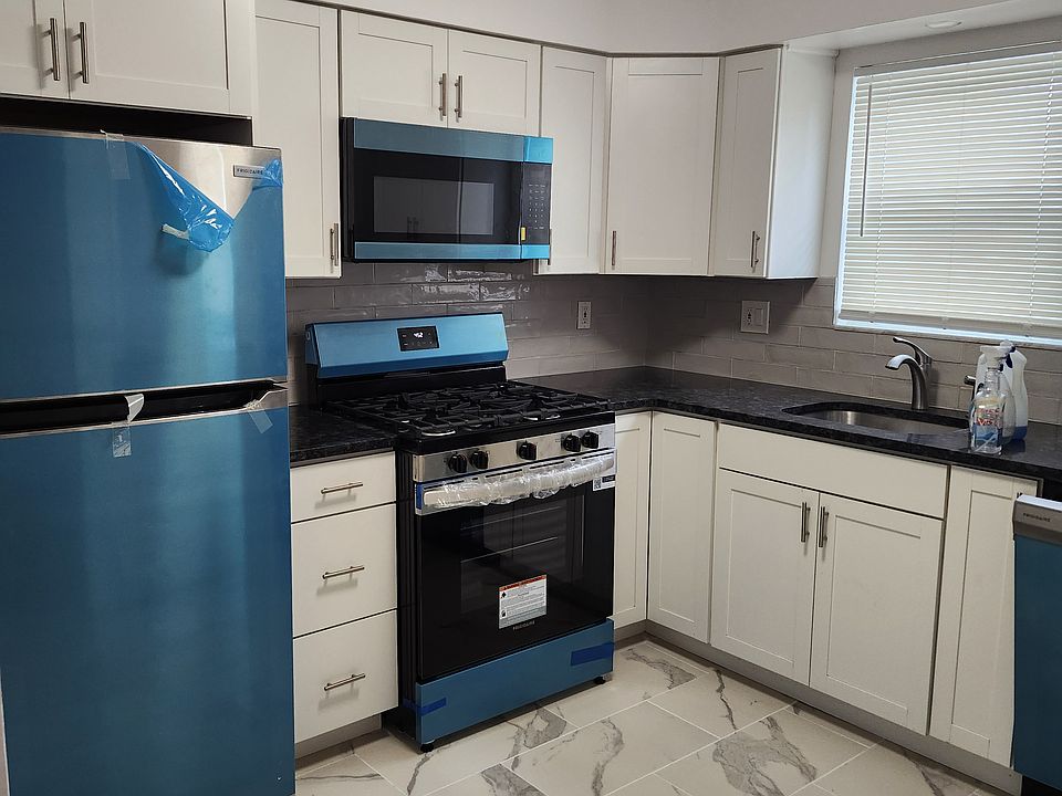 Modern white kitchen with quartz countertops, BRAND new SS appliances, and stylish grey tiled backsplash
