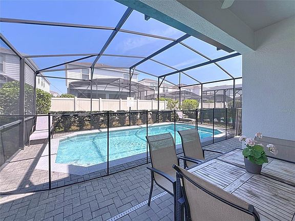 Heated private poolCovered lanaiThemed bedroomsGranite countertopsOpen floor conceptPool deck areaLight color cabinets