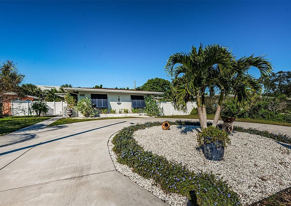 Delightful Dunedin bungalow. Lush tropical landscaping welcomes you along with a expansive circular driveway. Plenty of room for guest parking at this wonderful beach style home. Crushed shell flower beds with butterfly plants. Just a block from St Joseph Sound and a quick stroll to the Dunedin Beach Causeway and Honeymoon Island State park. Home offers three full size bedrooms and two full size bathrooms. Lovely terrazzo floors along with rich laminate flooring in guest bedrooms and kitchen. Bright and open kitchen with white Shaker style cabinets, butcher block countertops/breakfast bar and sea foam green backsplash completes this coastal themed kitchen. Newer stainless steel appliances. Split floor plan offers two guest bedrooms and a updated guest bathroom on one side. Primary bedroom and attached bathroom on the far side. Bathroom has been updated with double vanity, newer tub and tile surround. Wide open living and dining areas for a casual lifestyle. Dining room has an expansive picture window that overlooks the fully fenced backyard . Large inside laundry room with stacked washer and dryer and laundry tub. Door from dining area leads to patio and backyard which has a newer oversized garden shed(known as the barn to the family). Exterior patio door has a doggie door and magnetic collars which will convey to the new buyer. Second shed around the side of home for additional storage. Double gate is perfect for water toys storage. Raised vegetable bed garden area. Owner installed a new sprinkler system so that the majority of lawn is watered with reclaimed water. One larger sprinkler head and hose at garden shed is potable water to water vegetable garden. Second potable sprinkler head in front for irrigating herb garden. Sheds will stay but remaining lawn furniture, swing and deck box are excluded. New Trane A/C installed in 2020. The Pinellas Trail is at the entrance of the neighborhood and provides easy access to Dunedin Beach or a relaxing bike ride into the world famous, Historic Downtown Dunedin.