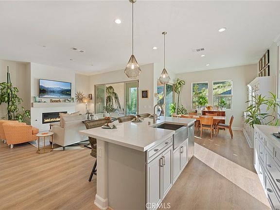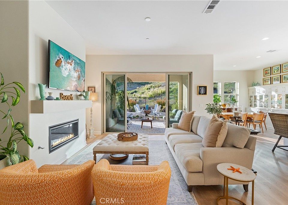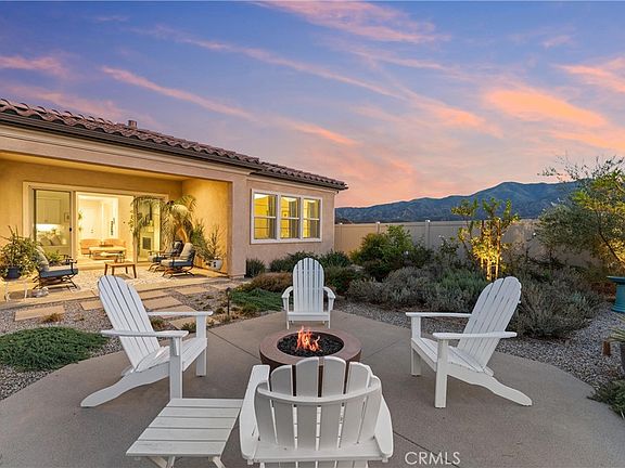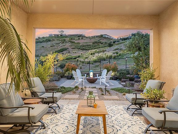 55+ RESORT-STYLE LUXURY LIVING | 1-STORY | PANORAMIC VIEWS | FULLY PAID SOLAR | GUARDED + GATED | Welcome to this beautifully upgraded home in the highly desired Terramor — where modern luxury and comfort meet in a vibrant community! A welcoming front patio with mountain views sets the stage for easy living in this elegant residence. Step inside to be greeted by abundant natural light, gorgeous luxury plank flooring, & an impressive array of upgrades. The open-concept Living Room has a warming fireplace & a 2-panel sliding glass door that extends your living space into the grand California Room & fully landscaped yard, creating the perfect blend of indoor-outdoor living. The chef-inspired Kitchen boasts stunning quartz countertops, breakfast bar seating, upgraded cabinetry, stainless steel appliances, pot & pan drawers, under-cabinet lighting, and oversized walk-in pantry. The Dining Room offers convenience for entertaining with a second slider to the backyard & a built-in china hutch with glass display doors—adding style & function. The Primary Ensuite Bedroom is spacious & filled with natural light, creating a serene retreat. The spa-like Ensuite Bathroom showcases quartz countertop, dual sinks, an oversized frameless shower with seating, upgraded cabinetry, & a walk-in closet with custom built-ins. Bedroom #2 enjoys stunning mountain views, while the Builder's spacious optional Bedroom #3 is currently a combined office/den. Bathroom #2 includes quartz counters and a shower-tub combination. Additional highlights include a separate Laundry Room with extended cabinetry and utility sink, and a Mudroom featuring a custom upholstered bench and extra entry storage for convenience. Step outside to your private backyard retreat, complete with a covered California Room, firepit with dedicated gas line, gazebo-covered dining area, a 2nd gas line for your BBQ, an oh-so-perfect lavender garden, and captivating sunset panoramic views. Energy efficiency is top-of-the-line with fully paid solar system, EV outlet, tankless water heater, whole house fan, drip irrigation & recessed lighting. Amenities include 2 clubhouses (55+ Only and All Ages), indoor & outdoor pools, fitness center, wellness studio, tennis, pickleball, miles of trails, dog parks & sports fields. Nearby find shopping, restaurants, cinemas & quick access to OC via 15/91 Expressways & 241 Toll. This remarkable residence offers the perfect blend of elegance, privacy, & modern comfort — welcome home!