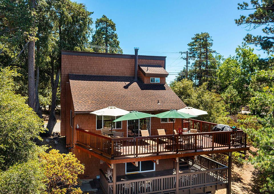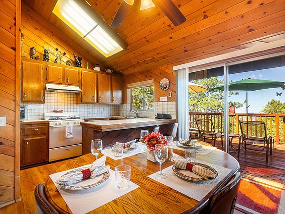 Paradise Pines Retreat - Views, Views & More Views! Welcome to this extraordinary mountain getaway, lovingly maintained and designed for carefree living. Set on two side-by-side lots totaling nearly 1/2 acre, this retreat offers space inside and out to relax, entertain, and soak in its breathtaking location. The main level features a spacious bedroom and full bath, along with an inviting kitchen, dining, and living area accented by warm vinyl flooring and rustic wood ceilings. Upstairs, you'll find a light-filled sleeping loft with half bath and laundry, plus an additional guest bedroom. Skylights keep the cabin bright in summer and cozy in winter. A private studio apartment with its own entrance sits on the lower level, ideal for overflow guests or rental income potential. The true highlight? Stunning sunset views from the upper deck, as well as from the home's interior living spaces. A circular driveway provides ample parking, and you're just minutes from the Village of Idyllwild's shops, restaurants, and hiking trails.
