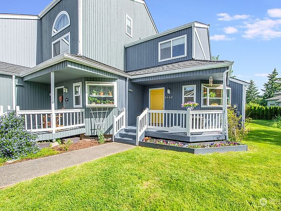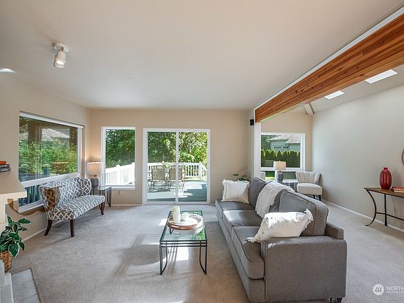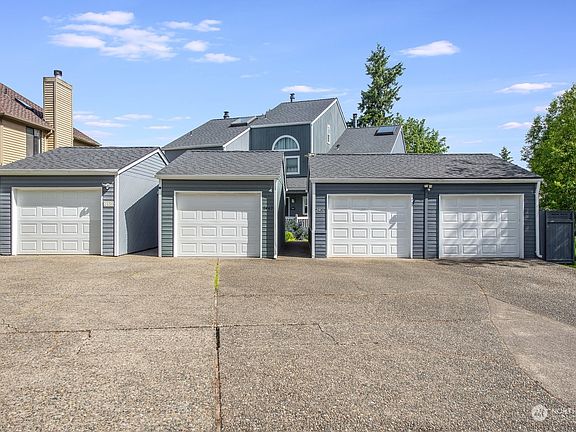 Spacious & bright end unit townhouse in gated community of Falcon Ridge. Huge windows look out to protected greenery. A gas fireplace warms liv room. A 2nd area next to living room is perfect for office. Dining room holds large table. Abundant kitchen counter & storage space. Primary bedrm has room for king size bed, big bath & a view toward mountains, city & lake. 2nd bedroom is good size. Home is a triplex structure & has 2 individual garages + driveway parking. No HOA dues for the triplex. Dues for Falcon Ridge community HOA are $84 per month. Newer windows, & appliances in 2017. H20 heater is new. TV's & sound system stay. Less than 15 minutes to airport, Southcenter, The Landing, parks & bike trails. Fenced RV rental spaces available.