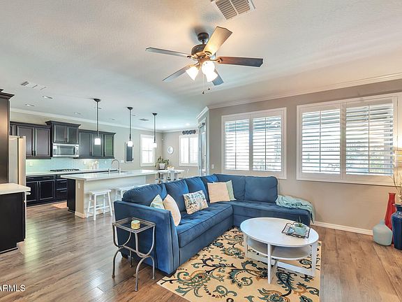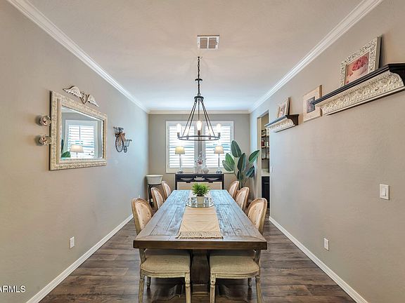 Must-see stunning home with upgrades galore! Step into luxury with this beautifully upgraded home featuring a popular great room floorplan and a split bedroom arrangement for optimal privacy or multi-generational living. Gourmet kitchen is a chef's dream boasting oversized cabinets, quartz countertops, gas cooktop, dual ovens and a spacious walk-in pantry and butler's service. Separate dining room offers the perfect space for entertaining or can easily be transformed into a home office. Soaring 10-foot ceilings w/ crown molding add elegance thruout, while plantation shutters provide timeless style. Owner's Suite is a true retreat with dual vanities, a large W-I shower, soaking tub and impressive closet. Step outside to your fabulous back-yard oasis complete with a heated pool/spa..... and lush yet low-maintenance artificial turf with plenty of space to relax and entertain. This home is perfect in every way and near the new Winco grocery under construction, Home Depot shopping and dining in San Tan Valley, and minutes from Queen Creek marketplace and entertainment galore. Don't miss the opportunity to make this home yours!