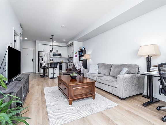 Modern and spacious 1-bed, 1-bath condo at Sky Gate. Built in 2022, this unit has been well-maintained and is in near-new condition. This third-floor unit on the outer north-west facing side of the complex has a large covered deck, 9' ceilings, an open floor plan, and a huge gallery window, providing plenty of sunlight. The kitchen features Samsung stainless steel appliances, soft-close cabinetry, and quartz countertops. Luxurious wide-plank flooring throughout, and a welcoming carpet in the bedroom. Bright 4-piece bathroom with a soaker tub. Includes an in-suite laundry room with a storage area, and a designated underground parking stall with adjacent storage space. Built green and energy efficient with triple-pane windows and a heat pump for heat and air conditioning. This pet, family and rental-friendly building is rich in amenities, including a rooftop deck, gym, dog run, community garden, recreation room, guest suites, EV charging stations, and visitor parking.