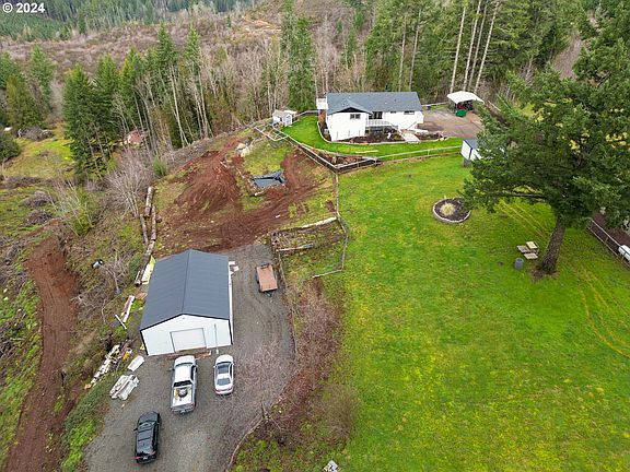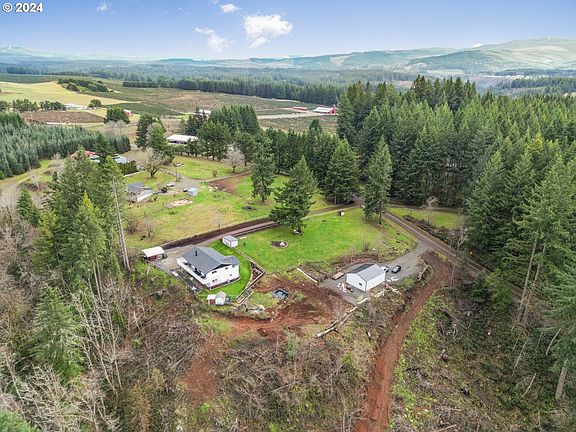 Stunning residence on 6.39 acres of serene and private property, this beautiful home has breathtaking views of sunsets to the west and the surrounding forested hills, providing the perfect backdrop for a tranquil lifestyle. The open-concept main level welcomes you with new flooring, creating a seamless flow throughout. The living and dining area feature a cozy pellet stove and convenient sliders leading to the upper wrap around deck, offering a perfect spot to enjoy the scenic vistas. The updated kitchen showcases new Samsung appliances, custom cabinets with a soft-close system, and elegant quartz countertops. The main floor has a spacious updated primary suite, complete with a walk-in closet, a private bathroom featuring double sinks and a large walk-in shower, and sliders opening to the deck. Two additional bedrooms, one with sliders to the deck, and a full bathroom complete the main level, providing comfortable living spaces for all. The lower level offers the potential for dual living with a private entrance, a large bonus room, an additional bedroom, and a bathroom. This flexible space is perfect for guests, extended family, or creating a home office. The outdoor haven is equipped with a large shop, a goat barn, and two chicken coops, one of which is wired with power and lights, ideal for raising farm animals or pursuing your homesteading dreams. A natural spring and creek on the property enhance the overall charm and appeal. For added convenience and peace of mind, a new 220KW Cummins generator powers the entire home and property, ensuring uninterrupted comfort in any season. Situated close to Metzler Park Campground and Milo McIver State Park, this home provides easy access to hiking and biking trails, allowing you to explore and connect with nature.