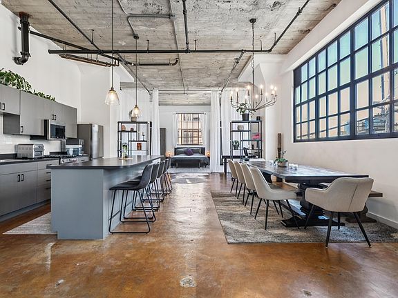 Large islandModern updatesIndustrial loftOversized black enamel pendantsStriking chandelierOpen loftLarge basement storage closet