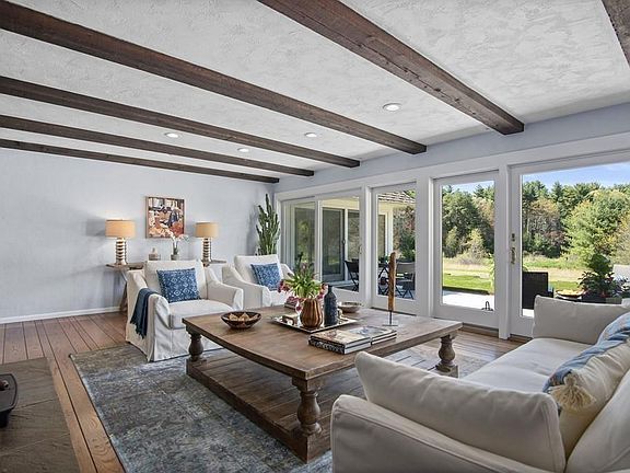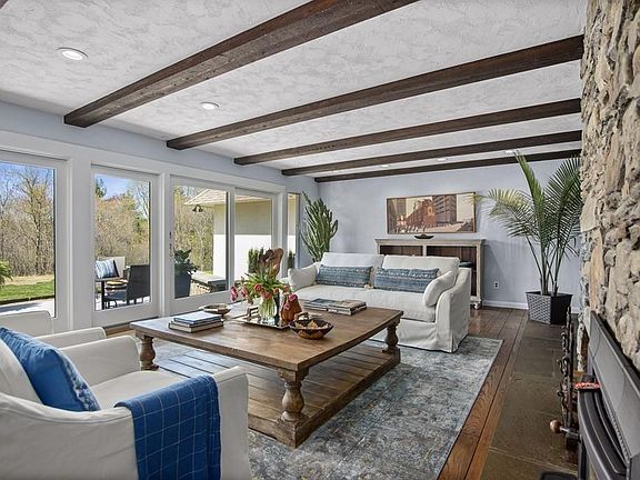Stunning French Country Style home on 7 acres of manicured land. A truly unique home and very rare find in this area. Private drive is a dramatic approach to the front entrance. The grounds boast pristine landscaping with fruit trees and flowers, abutting Hop Brook conservation land & wildlife sanctuary. Architectural details include exterior and interior stone walls, stone walkways, dramatic double front wooden doors and wood columns. 4 bedrooms including a master suite with a wall of glass overlooking this breathtaking natural setting. Spacious and bright living area with wood burning fireplace, original hardwood floors and beamed ceiling. First level also includes a family room, office, laundry room, full bath, half bath and 2 more bedrooms. Second floor is a wonderful, sunny area perfect as a bedroom or playroom or office/studio. 2 car garage with ample outside parking. Original kitchen and bathrooms await your personal touch.