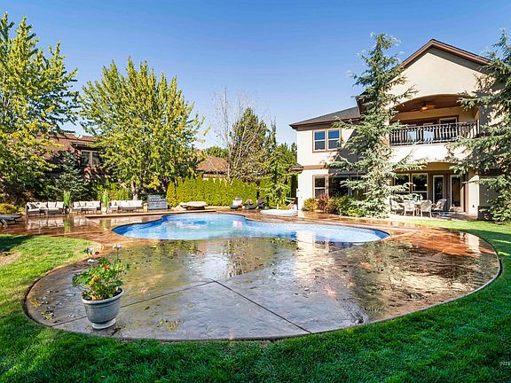 Stunning Highland Homes custom-built showcase property on more than one acre in the exquisite and desirable Laguna Pointe neighborhood, for luxury living in the heart of Eagle, Idaho. Your private retreat awaits, greeting you with a serene rock waterfall feature, double door entry and grand custom interior finishes. Master suite with balcony overlooking the resort style back yard, fountain and pool/spa. Four additional bedrooms each with ensuite bathrooms, theater room with wet bar and equipment, and spacious separate upstairs bonus room. Formal living and dining rooms in addition to great room living space. Chef’s gourmet kitchen, butler's pantry and large island/bar to inspire your culinary creativity. Extraordinary 8 car/RV garage and oversized double lot with garden spaces, mature landscaping and much more. Amazing idyllic resort community in the heart of it all with access to white-sand beaches of the private lake and Boise’s best outdoor lifestyle.