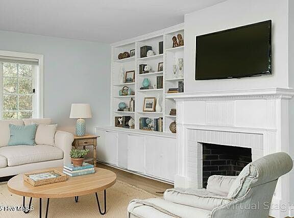 Large windows welcome in natural light, and the living area features a centrally located fireplace that adds warmth and charm. The kitchen overlooks the backyard, keeping the flow connected and functional for daily living.