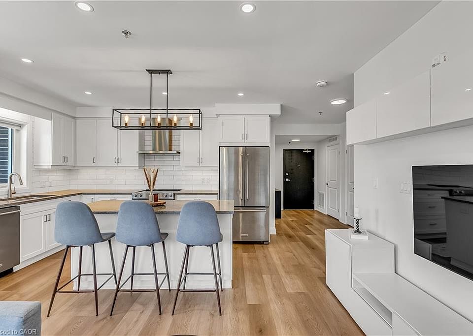 Experience upscale living in this spacious end unit executive condo, ideally situated in Waterloo’s sought after Carriage Crossing community. This beautifully designed home offers 2 bedrooms and 2 full bathrooms, including a primary suite with a double closet and private ensuite. With 2 dedicated outdoor parking spaces, this home combines style with convenience. The open concept kitchen is a true highlight, featuring a large island, quartz countertops, and stainless steel appliances, perfect for both cooking and entertaining. Just off the kitchen, step onto an enormous balcony with three distinct seating areas, an entertainer’s delight for gatherings or quiet evenings outdoors. Additional upgrades include modern bathrooms with quartz vanities and comfort-height toilets, an in-suite washer and dryer, a high efficiency water heater, water softener, and an HRV system for fresh air circulation year-round. Just steps from Grey Silo Golf Course, scenic walking trails, RIM Park Community Centre, and the RIM Technology Park, it offers the perfect balance of luxury and lifestyle.