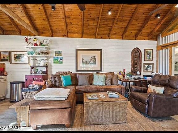 Nearly 8 acres of Paradise located 20 minutes from Lafayette. This Cottage is on a 5-acre stocked Lake nestled in St Landry Parish one mile from Lafayette Parish. This is the ultimate retreat for the outdoor enthusiast, avid fisherman and ideal for large gatherings. The 500 SF cottage and 400 SF glassed-in porch- sunroom combines rustic charm with modern amenities and a breathtaking view of the lake with waterfowl visitors. The cottage has spray foam insulated roof floor and walls, making it comfortable year-round. The cottage is heated and cooled by 2 mini-split units and 3 ceiling fans. Finishes include whitewashed shiplap walls, luxury vinyl tile floors, and stained cathedral ceilings. It has 1 bedroom, a loft, an open concept kitchen, living and dining area and one bathroom. The porch-sunroom also has an area for an extra refrigerator and stacked washer and dryer behind antique barn doors. Step outdoors onto large cement and stone patio with picnic tables and chairs. Enjoy the breeze off the lake in the two swings under mature oak trees. The yard has a 14 Ft diameter gazebo with built in seating surrounded by flower beds. There is a recently installed bulkhead closest to the cottage, gazebo, and BBQ area.
