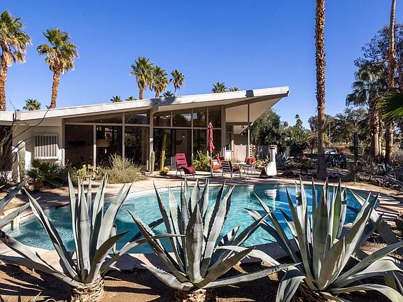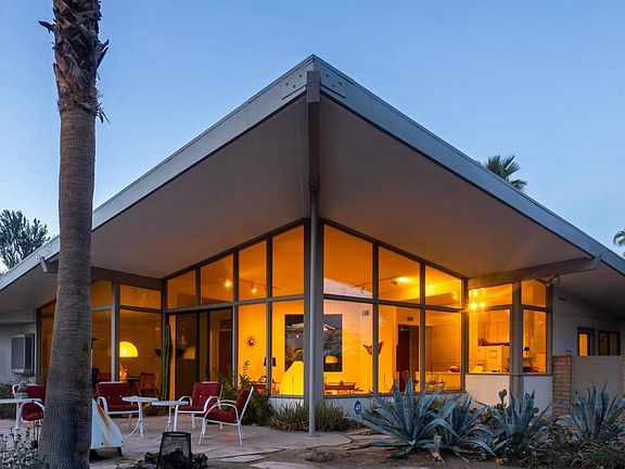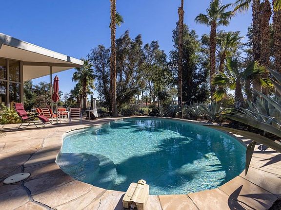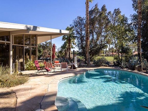 Exceptional MCM design 3BD/2BA desert resort home at de Anza Country Club. Soaring vaulted roofline and angular walls of glass blur lines and bring the outdoors in. The view south is to trees lining the verdant 15th green and north is a panoramic view of the Santa Rosas. Enjoy cocktails, BBQ and sunset by the pool looking west to Indian Head. Attributed to Architect William Perry who was a draftsman with San Diego Master Modernist John Mortenson at the time of construction and is one of only two Mortenson inspired or actual designs in the Valley. The floorplan features separate owner and guest wings. Primary bath and ensuite are to east with guest bedrooms sharing bath to west and separated by kitchen dining and living room combined into open great room. 3rd BD currently used as media/library room but would also double as office. Primary and main guest bedroom have access and views into front patio. Landscape is low maintenance desert design with drip irrigation. Two HVAC systems allow for zoned cooling and energy efficiency as well as evaporative cooler for great room. Glass is double pane to increase energy efficiency and comfort. Septic System replaced in the past several years. Borrego Springs is San Diego’s desert resort and de Anza Country Club is one of the most sought- after neighborhoods with no HOA. Club Memberships are available and if golf isn’t your game the community offers extensive hiking, biking and a vibrant arts community. Borrego Springs is an International Dark Sky community that treasurers its views of the heavens. Surrounded by Anza Borrego Desert State Park, Borrego Springs harkens back to Palm Springs of 75 years. This is your desert oasis accessible from San Diego, Los Angeles and Palm Springs. Home was featured as part of 2009 Borrego Modernism tour. The unique design includes deep overhangs and dramatic roof line offering shade and shelter from the climate extremes. Extensive use of covered outdoor patios, sliding doors, and intimate entry courtyard allow the home an effective and comfortable connection to its landscape. Owner has maintained the design true to its mid-century heritage with period paint colors and furnishings.