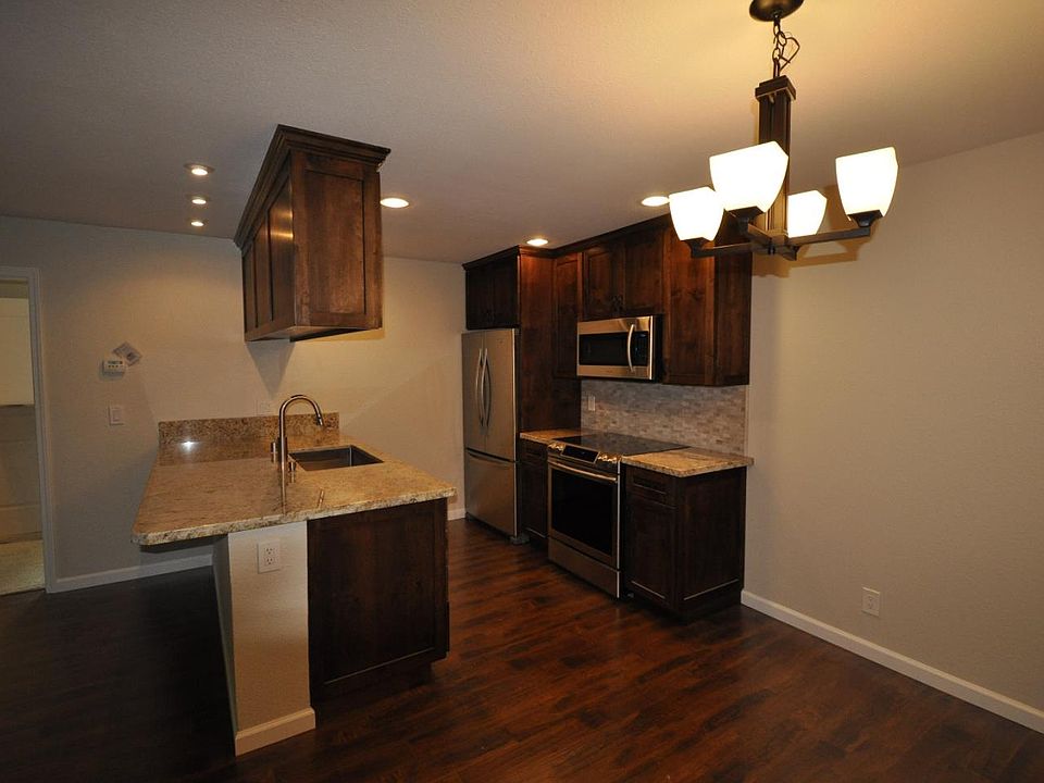 Gorgeous condo has been completely remodeled and everything is new including: kitchen cabinets, granite counters, all appliances, custom lighting thru-out, flooring, interior paint, new bathroom, sliding door and patio tile. Even the forced air heater was replaced and installed with custom sheet metal work. Nothing was left out, everything was torn out and replaced. Must see this condo to believe all the work that has gone into it. Complete remodel! Ready to move in. Great, quiet location within the complex is close to parking and easy access to all transportation and shopping. Enjoy the vast green spaces and walking paths thru the complex as well as the community pool. Secured complex with onsite property manager. You will love this completely remodeled condo!
