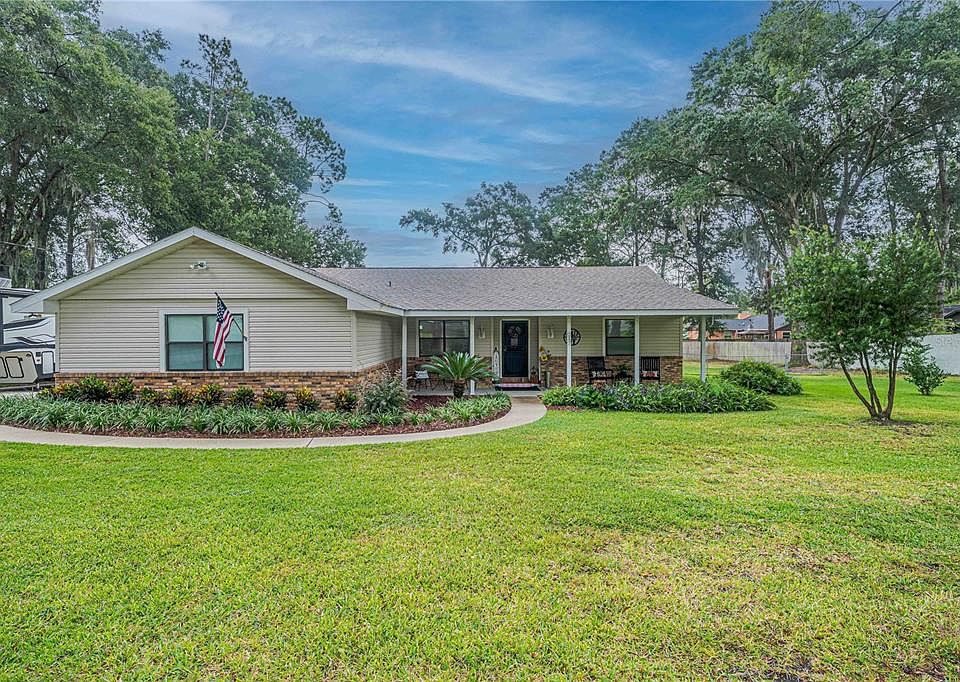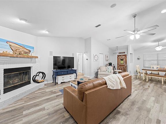 NO HOA!!! Welcome to this beautifully maintained 3-bedroom, 2-bath home set on a spacious .62-acre lot with outstanding outdoor living spaces. The open-concept floor plan features a woodburning fireplace, butcher block countertops, a large center island with built-in charging station, and surround sound speakers in the living area—perfect for entertaining. A 330 sq. ft. four-season lanai opens to a 12x16 deck overlooking a private backyard with fire pit and lush landscaping. The 16x10 bonus room makes an ideal office, homeschool room, or optional 4th bedroom with a freestanding closet included. The primary suite offers custom-built closets, rounded architectural corners, a jetted tub, and a custom tile shower with a unique curved design. Additional highlights include gas heat and water heater, irrigation system, custom laundry cabinetry, garage workshop with built-ins, and an RV CARPORT / WORKSHOP with 30-amp hookup and storage room. The home also features a wheelchair lift in the guest suite (removable at buyer’s request). Sidewalks along the road make for enjoyable evening walks in this welcoming neighborhood. This home truly blends comfort, functionality, and outdoor enjoyment in one perfect package!