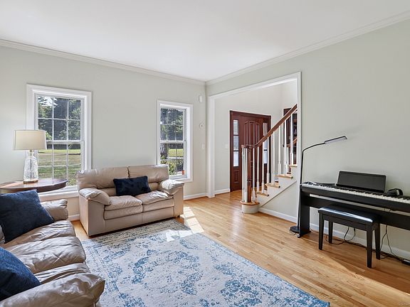 This beautiful custom-built 4-bedroom, 3.5-bath Colonial is nestled on 3.44 private acres and offers over 3,700 sq ft of living space. A gracious two-story foyer welcomes you into a private office with built-ins and glass French doors, and a front-to-back living/dining room. The chef's kitchen spans the back of the home with stainless appliances, double ovens, 5-burner gas range, pantry, breakfast bar, and eat-in dining, opening to a spacious family room highlighted by a dramatic 2-story stone fireplace and second staircase. Upstairs, the primary suite features a tray ceiling, custom walk-in closet, and spa-style bath with whirlpool, shower, and dual vanities. Three additional bedrooms, a full bath, laundry, and an unfinished bonus room over the 3-car garage provide flexibility. The finished walk-out lower level with full bath, laundry, and kitchenette is ideal for guests, in-laws, or a teen suite. Additional highlights include central air, hardwood floors, 9' ceilings, central vac, and security system. Located in a classic New England town with shops, restaurants, and endless outdoor recreation-near McLean Game Refuge, Rails-to-Trails, Simsbury Farms, and Simsbury Meadows. Convenient to Routes 10 & 202, Hartford, Bradley Airport, and midway between Boston & NYC.
