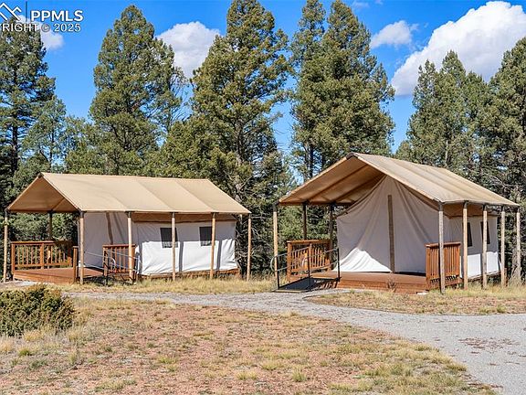 One of the most unique and special properties available, a true outdoor lovers paradise. Adjacent to the 6,000 acre Florissant Fossil Monument, this gated and cross fenced 41 acre playground features a fantastic year round home with natural stone exterior. Expansive western views of the Collegiate Peaks from top floor with vaulted ceilings and huge wrap around deck to catch epic sunsets. 5 bedrooms (1 non-conforming), 4 baths (3 updated), covered porch off top floor master. Second master on main, along with wet bar/kitchenette. 2 living rooms with natural fireplaces, game room in basement with pellet stove, pool table, and garage access. 7 total garage spaces (1 car attached and two 3 car detached) plus shed. No hoa on the 40 acre parcel, Pikes Peak views, Ag zoning w/cattle grazing lease in place. House sleeps 10+ guests, amazing STR potential. What makes this property really special are the privacy, views, spring fed pond, 9 hole frisbee golf course, year round 20’ yurt with wood burning fireplace, and gravel pathways to 5 seasonal high end glamping tents on raised trex decks, “hang out” / dining tent over new patio with 6 foot custom gas fire pit, and garage space converted to food storage and prep. So many possibilities to host 30+ family/friends/retreats at your private mountain escape. Two hours to Denver, one hour to Colorado Springs, and just 30 minutes to Woodland Park; one hour to Breckenridge, two hours to Monarch Ski Mountain. With a south facing driveway, and school bus route in the neighborhood, year-round access is a breeze.